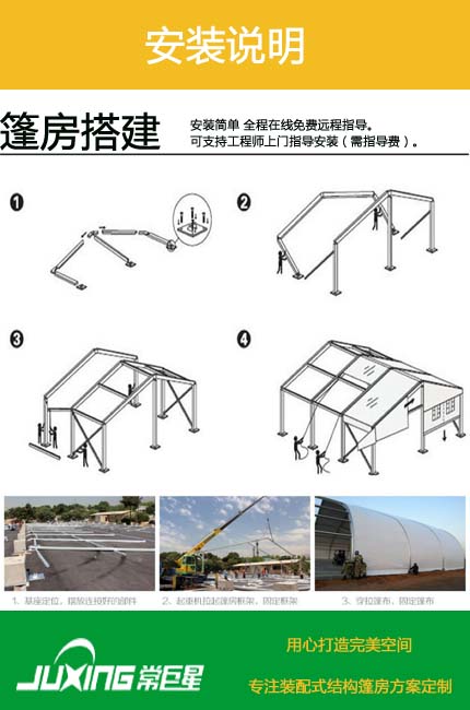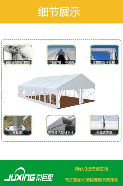 常巨星裝配式篷房公司是一家篷房研發(fā)、生產(chǎn)、銷售、租賃于一體的綜合性篷房公司。巨星公司秉著誠信經(jīng)營、客戶至上的經(jīng)驗理念服務客戶。本公司產(chǎn)品外觀簡潔大方,內(nèi)無支柱,百分百利用空間??蛇x配設施,可加照明,排水,防撞,地臺,空調(diào),發(fā)光燈箱,等系統(tǒng)?,F(xiàn)有篷房主體框架為中空鋁合金結構,連接部位為采用國家焊接鋼結構,可調(diào)節(jié)式基座可彌補場地的不平,篷房采用PVC篷布,該篷布具有不拉伸的良好性能,不透光,采用高頻焊接技術,篷房抗風能力達到80-100公里/小時。具有體積小,儲存方便,拆裝靈活快捷易運輸?shù)忍攸c,單位組合式結構,可根據(jù)場地的大小自由增加,對搭建場地無特殊要求,一般場地如草地、大理石地、瀝青地面、水泥地均可。篷房內(nèi)無支柱,場地空間得到利用